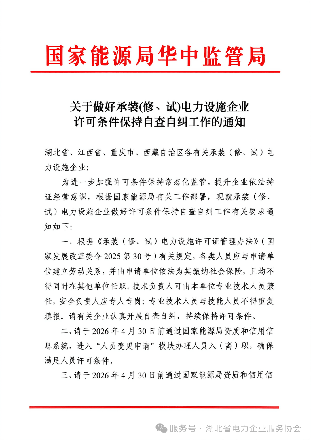 国家能源局华中监管局近日下发《关于做好承装(修、试)电力设施企业许可条件保持自查自纠工作的通知》,明确要求湖北、江西、重庆、西藏区域内的相关企业开展常态化监管对标。